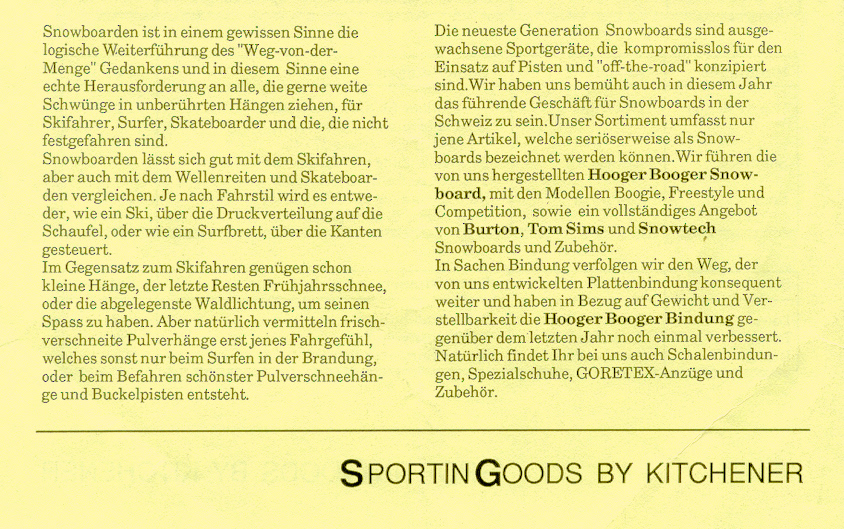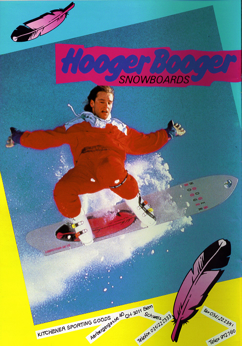 Hooger Booger by Kitchener. 1978 Kitchener starts to produce and distribute own skateboards in Switzerland under the brand Hooger Booger.